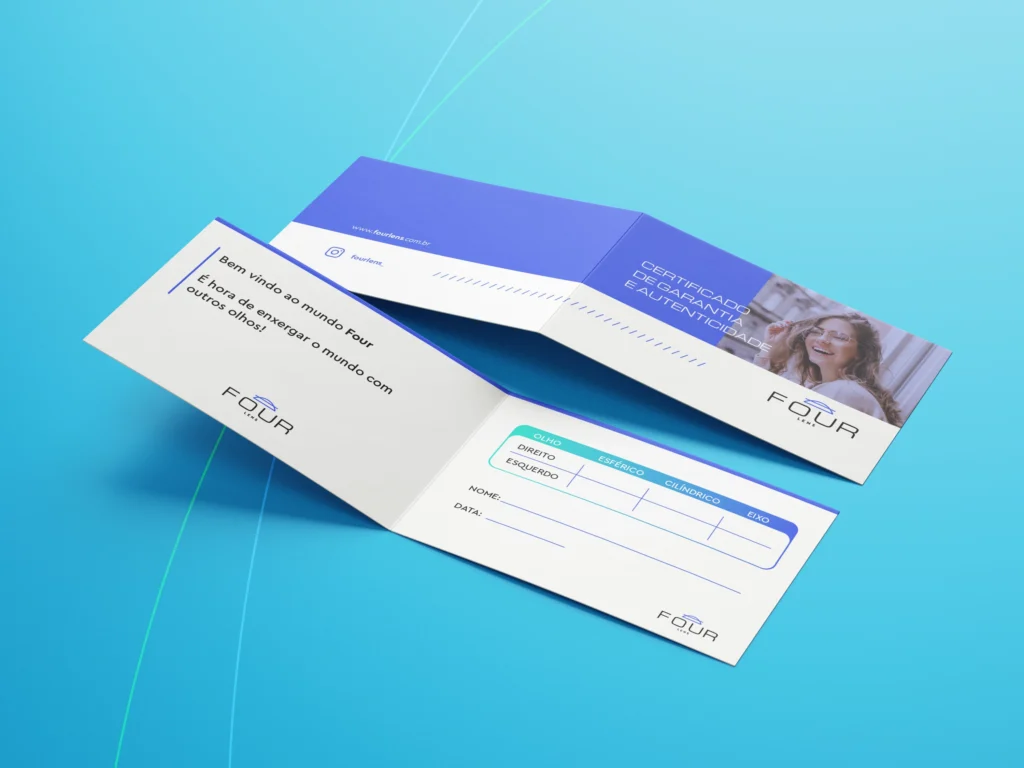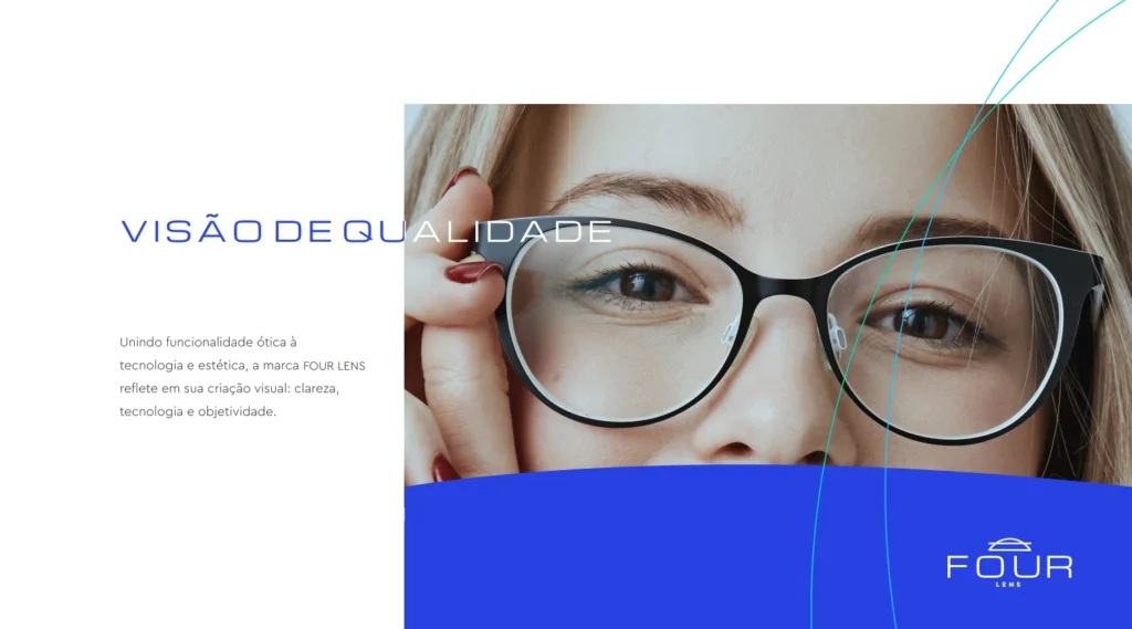 A identidade visual da Four Lens foi cuidadosamente projetada para refletir nossos valores de qualidade, inovação e sofisticação. O símbolo da marca é inspirado na curvatura da córnea, destacando nosso compromisso com a precisão e a tecnologia avançada.